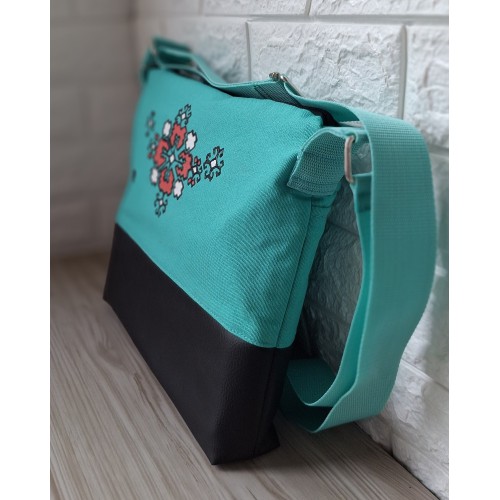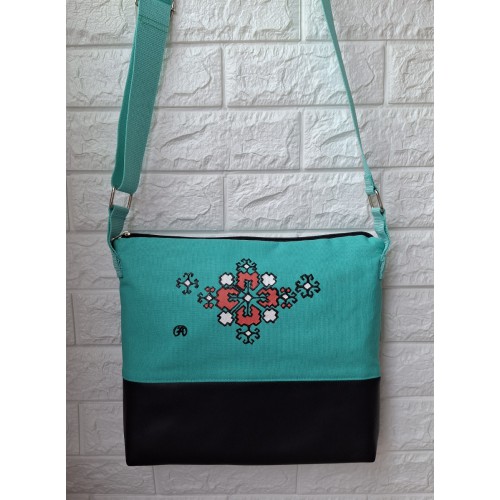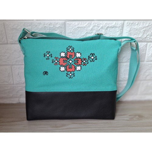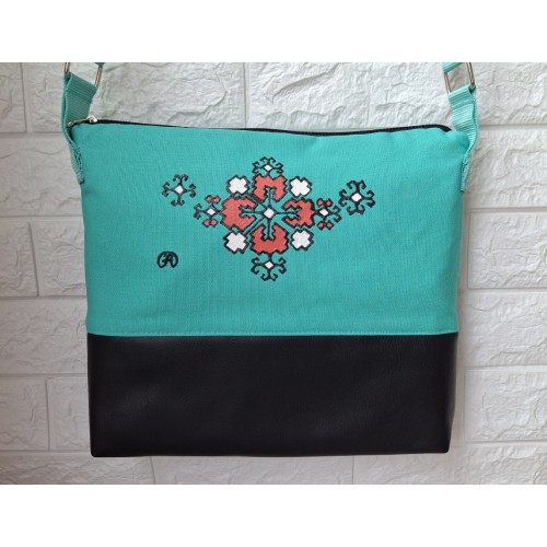 Кросбоди чанта в цвят тюркоаз с акцент - мотив от българския фолклор, рисуван с текстилни бои върху лицето на чантата.