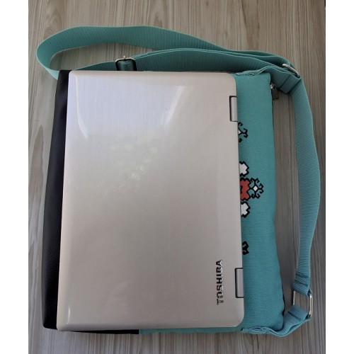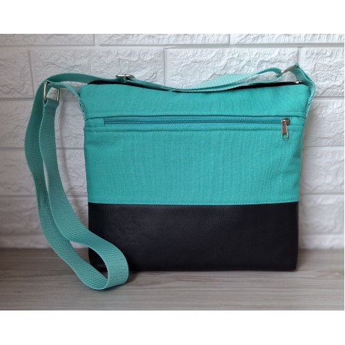 За да бъде интересна и различна, чантата е изработена от памучен плат тип "Брезент", в комбинация с черна еко кожа.