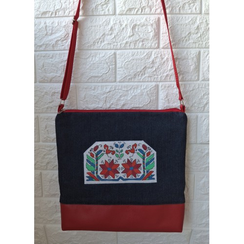 Чанта през рамо, изработена от ленен плат в комбинация с еко кожа. Ръчно рисуваната декорация е..
