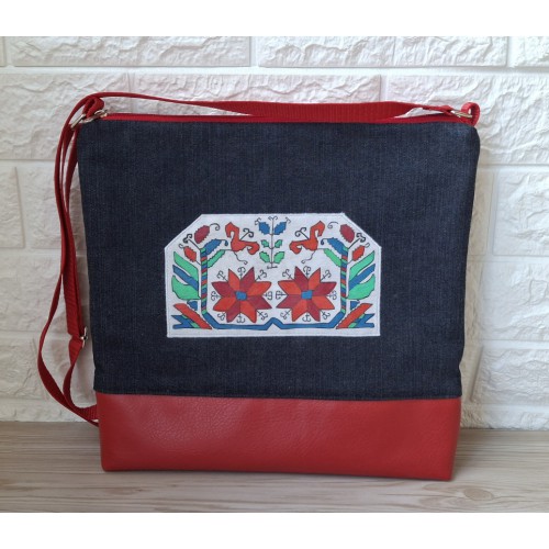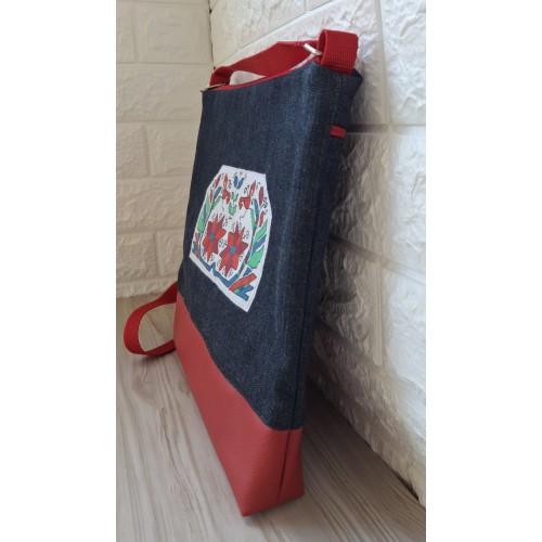 - деним и еко кожа, декорация - рисувана с текстилни бои.